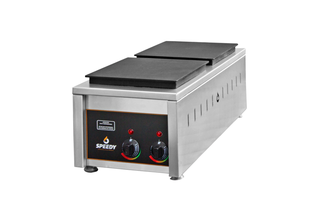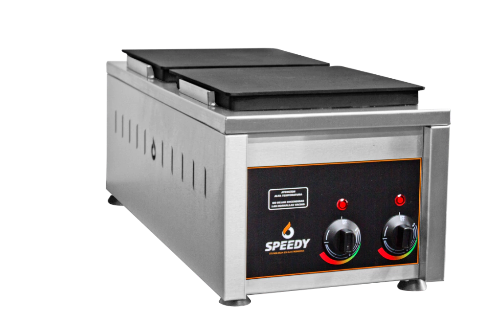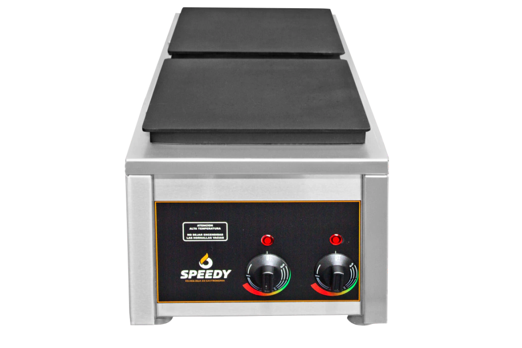 Ideal para cocinar y calentar, alta recuperación de temperatura. Hornallas de 2,5 kW cada una. Control individual de temperatura de 0 a 300º. Hornallas de acero 7 mm. . Medidas de hornalla 29 x 29 cm. Potencia total: 5 kW. *Opción monofásico o trifásico