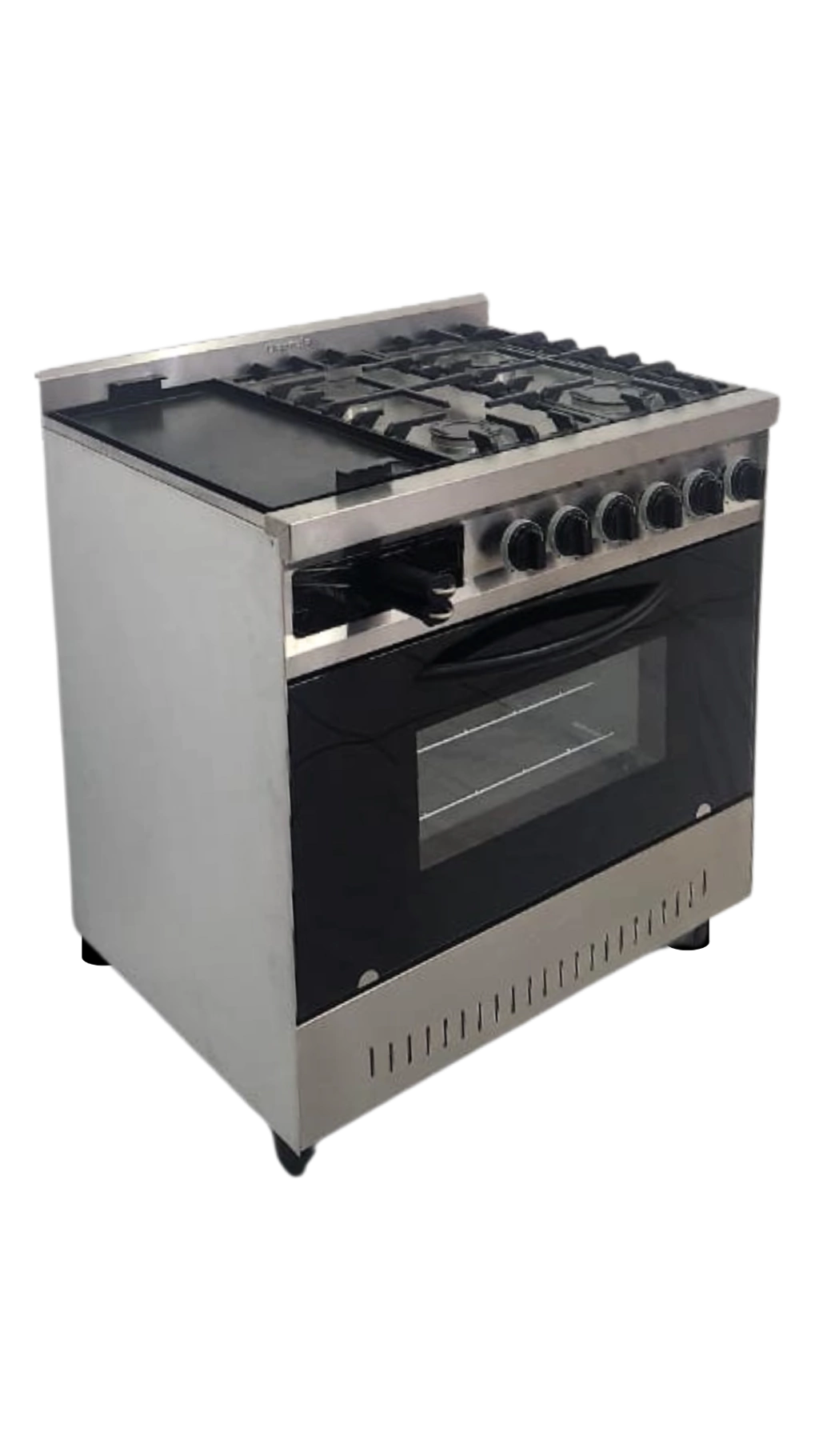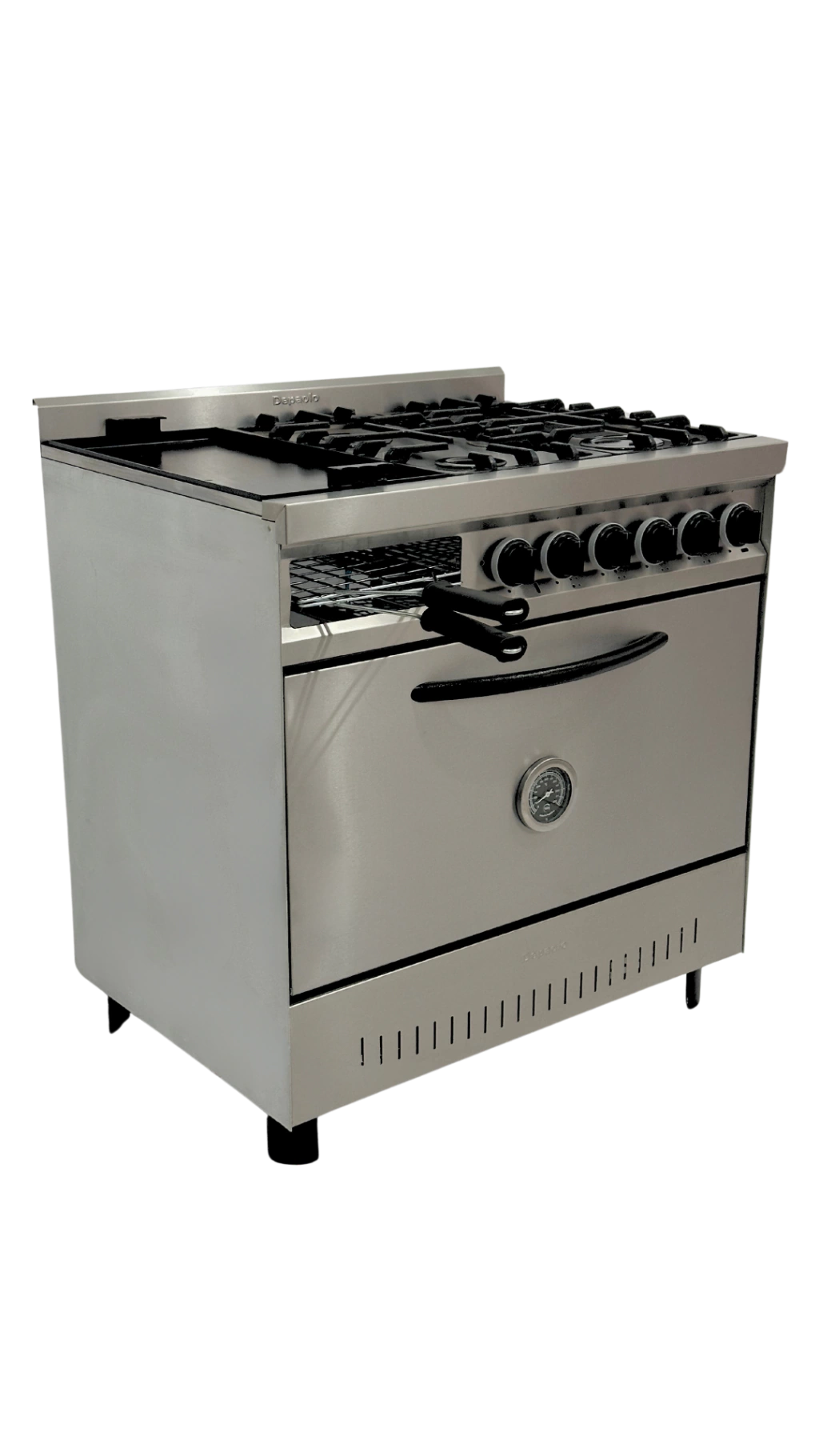 Mesada fija y frente en acero inoxidable esmerilado AISI 430. Valvula de seguridad en horno. Puerta visor en doble vidrio templado. Laterales exteriores en cincalum. 3 estantes y 2 rejillas removibles. Aislante termico de lana mineral en las recamaras. Perillas de Nylon. Piso de tejuelas refractarias.