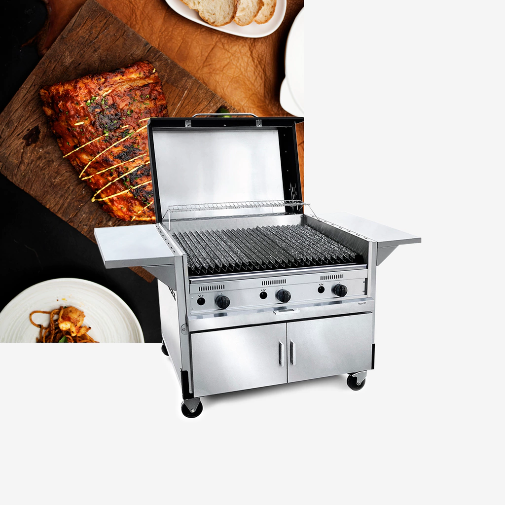 En fundición para cocción uniforme. Con tres quemadores independientes longitudinales de acero inoxidable.